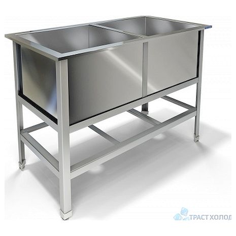 Ванна состоит из двух сварных ёмкостей мойки и каркаса. Мойка ванны сварная, выполнена из пищевой нержавеющей стали марки AISI 304 толщиной 0,8мм и имеет отгибы, которые исключают травмирование персонала. Каркас сварной из профиля толщиной 2мм, покрытого порошковой краской серого цвета. Ножки ванны снабжены регуляторами высоты, что позволяет устранить неровности пола. Ванны комплектуются нержавеющим выпуском с решеткой диаметром 90мм, диаметр выходного отверстия в сифоне 50мм.
