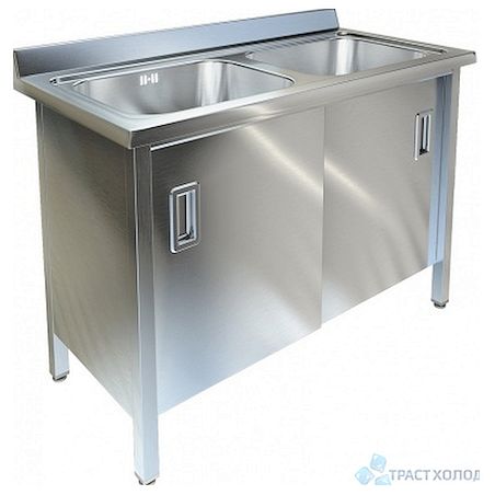 Ванна состоит из двухсекционной цельнотянутой ёмкости мойки и каркаса. Мойка ванны цельнотянутая с шумопоглощающей изоляцией снизу, выполнена из пищевой нержавеющей стали марки AISI 304 толщиной 1 мм и имеет отгибы, которые исключают травмирование персонала, а также объемный пристенный борт. Каркас изготовлен из нержавеющей стали марки AISI 304. Раздвижные дверцы "купе" позволяют сэкономить пространство кухни при их открытии. Ножки ванны снабжены регуляторами высоты, что позволяет устранить неровности пола. Ванны комплектуются сифоном с переливом, нержавеющим выпуском с решеткой диаметром 90 мм, диаметр выходного отверстия в сифоне 50 мм.