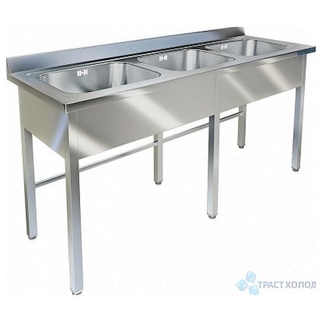 Ванна состоит из трехсекционной цельнотянутой ёмкости мойки и каркаса. Мойка ванны цельнотянутая с шумопоглощающей изоляцией снизу, выполнена из пищевой нержавеющей стали марки AISI 304 толщиной 1 мм и имеет отгибы, которые исключают травмирование персонала, а также объемный пристенный борт.  Каркас изготовлен из нержавеющей стали марки AISI 430. Ножки ванны снабжены регуляторами высоты, что позволяет устранить неровности пола. Ванны комплектуются сифоном с переливом, нержавеющим выпуском с решеткой диаметром 90 мм, диаметр выходного отверстия в сифоне 50 мм.