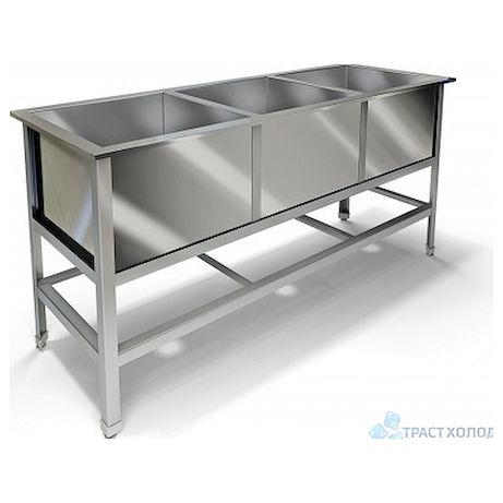 Изделие выполнено из стали AISI 304. Оборудование укомплектовано ванной с тремя секциями, заключенной в металлический каркас. Его ножки оснащены регуляторами высоты, поэтому предмет можно устойчиво установить даже на неровном полу.