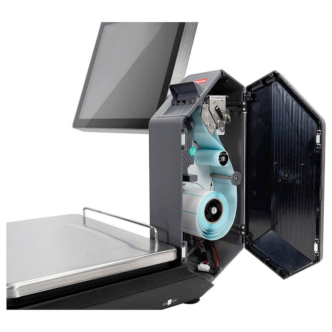 Конструкция весов состоит из устойчивого основания, стойки-держателя и сенсорного экрана. На основании закреплена весовая платформа. Внутри стойки находится принтер этикеток. На стойке нет съемной крышки: дверца закреплена на корпусе. В конструкции есть детали из металлических сплавов для утяжеления прибора.