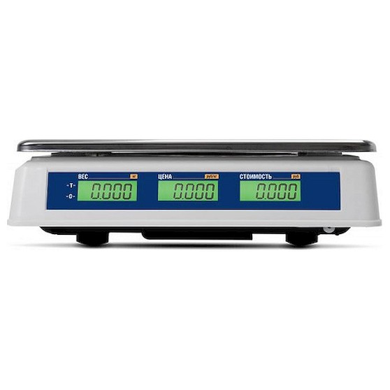 • Со стороны покупателя и со стороны продавца установлены 2 LCD-дисплея на 16 разрядов. Они показывают массу груза, цену за килограмм, итоговую стоимость покупки. Работа сопровождается визуальной и звуковой индикацией.