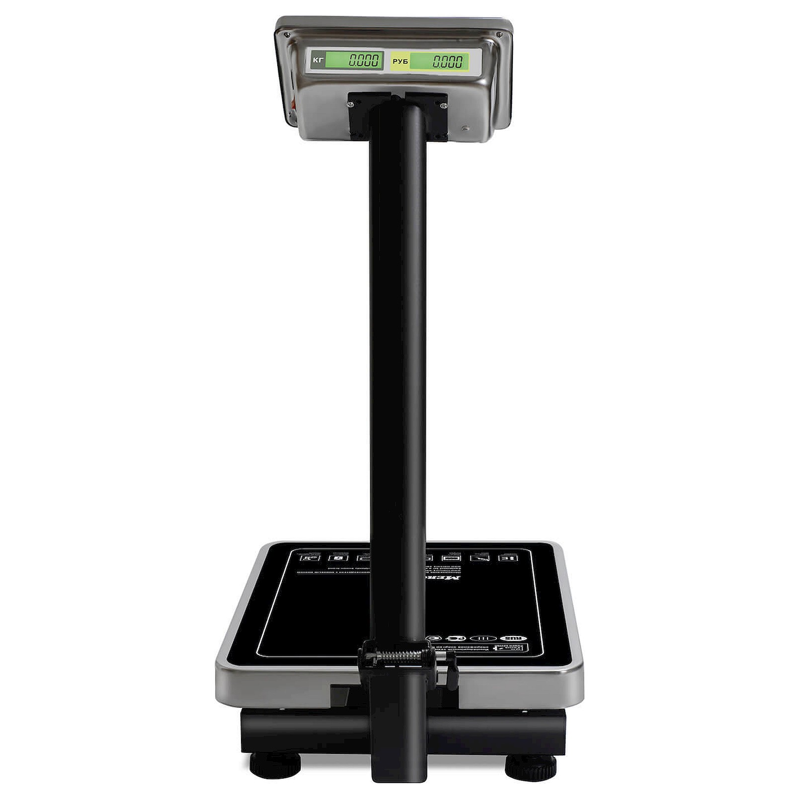 • На складной стойке находится двусторонний LСD-дисплей. На экране предусмотрено 16 разрядов индикации. Табло показывает массу товара, цену за 1 кг, общую стоимость покупки, сумму сдачи. Результаты видны и продавцу, и покупателю.