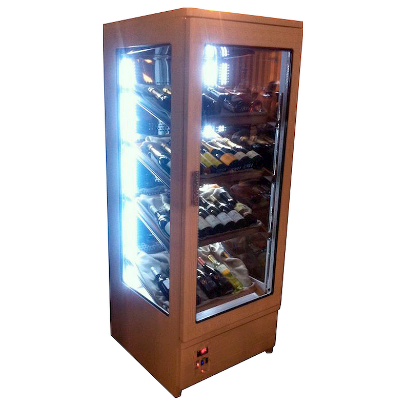 Витрина выполненна из панелей МДФ, ламинированных по особой итальянской технологии, позволяющей древесным слоям обеспечивать не только теплоизоляцию, но и промышленную долговечность витрины. Благодаря немецкой электронике витрина поддерживает любые температурные режимы работы. Витрина может быть поставлена как в одностороннем, так и в трёхстороннем варианте. Внутренняя экспозиция освещена яркой светодиодной подсветкой, которая может быть запрограммирована на отключение, когда витрина закрыта, т.к. вино не любит свет.