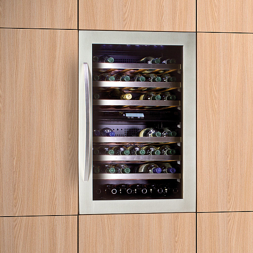 Модель оснащена электронным термостатом, цифровым дисплеем и подсветкой. Корпус выполнен из крашенного металла, дверь - из рамы из нержавеющей стали и двойного стекла с защитой от ультрафиолетовых лучей, полки - из дерева с металлической оправой спереди.