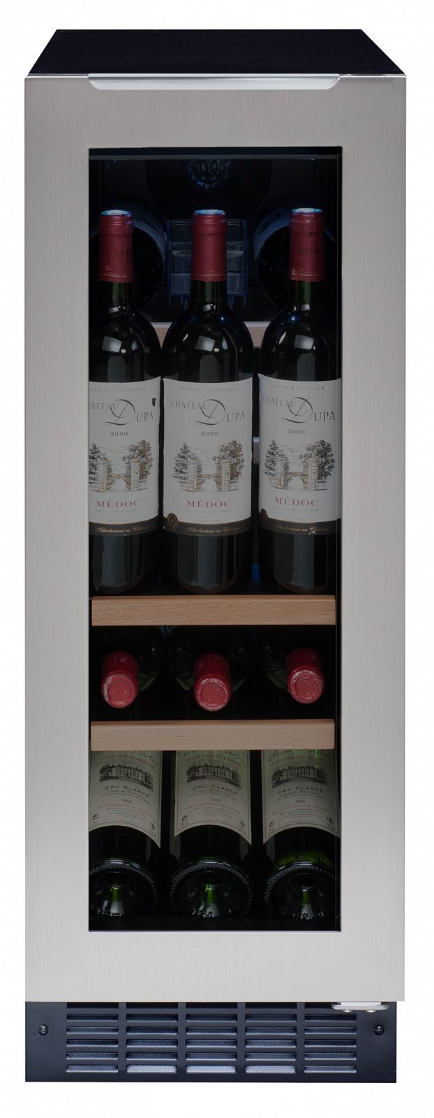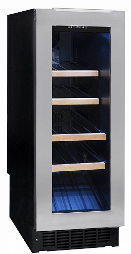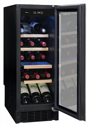 Винный шкаф рассчитан на 21 бутылку (типа Бордо). Оснащен электронным термостатом и удобными полками, позволяющими с легкостью доставать бутылки. Черный цвет и стильная рамка из нержавеющей стали позволяют вписать шкаф как в деловую, так и в домашнюю обстановку. Модель оснащена перенавешиваемой дверцей.
