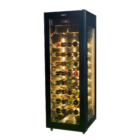 Эффектная, стильная модель серии Cavanova с минимальным потреблением электроэнергии, трехстороннее остекление из двойного, тонированного защитного стекла от УФ излучения и мягкая светодиодная подсветка. Винный шкаф имеет демонстрационный вид,