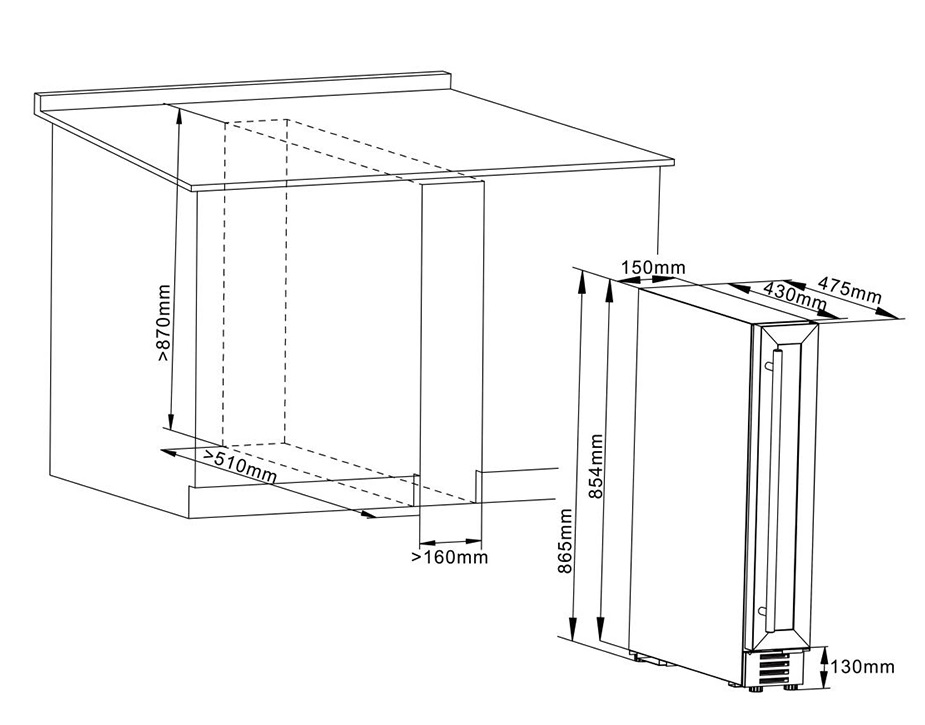 Винный шкаф устанавливается как отдельностоящий, так и встраиваемый под столешницу/в нишу.