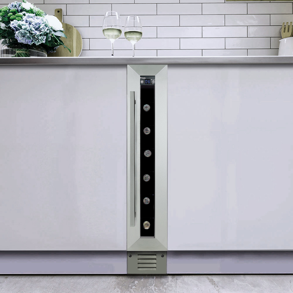 Сочетание стиля и компактного вида позволяет разместить внутри модели до 7 бутылок объёмом до 0,750 мл. Универсальная технология применения особого температурного режима внутри камеры, позволяет сохранить все вкусовые и изысканные свойства вина. Сенсорная панель управления придаёт современный вид, а однотонная LED-подсветка синего цвета подчёркивает современный стиль.