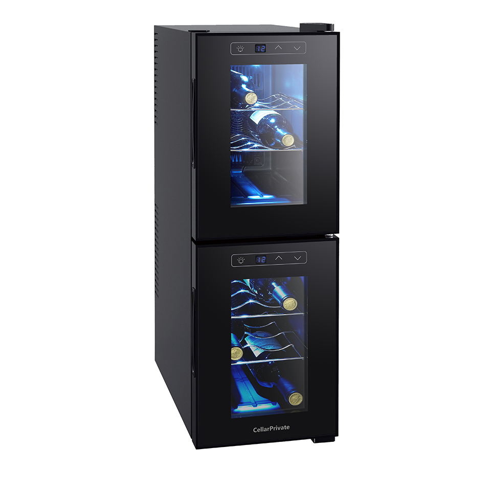 Модель имеет компактный размер и 2 независимые зоны охлаждения с универсальной технологией применения особого температурного режима внутри камер, тем самым позволяя сохранить все вкусовые и изысканные свойства вина. Винный шкаф оснащен дисплеями с цифровым управлением в каждой зоне, принудительной циркуляцией воздуха с помощью вентиляторов, LED-подсветкой синего цвета.