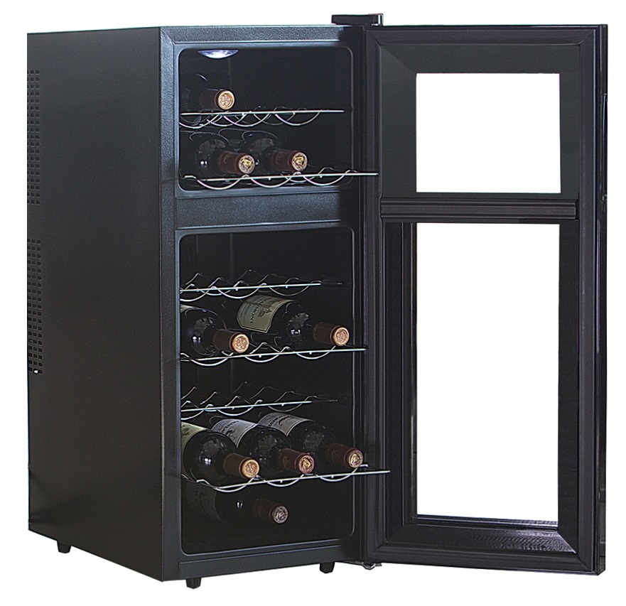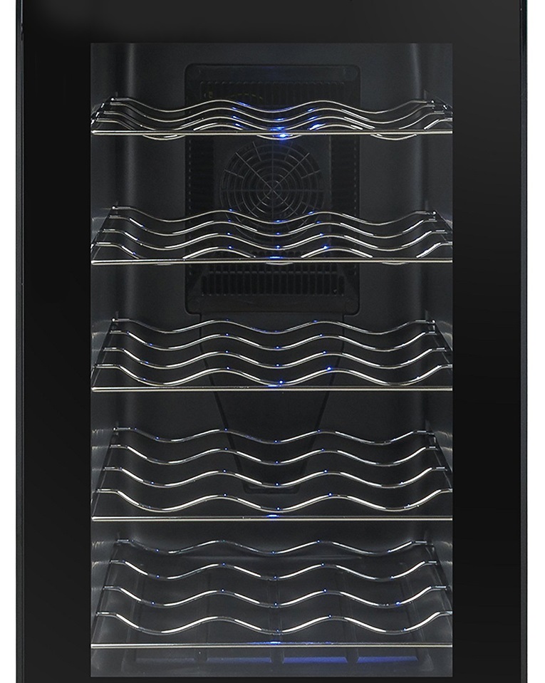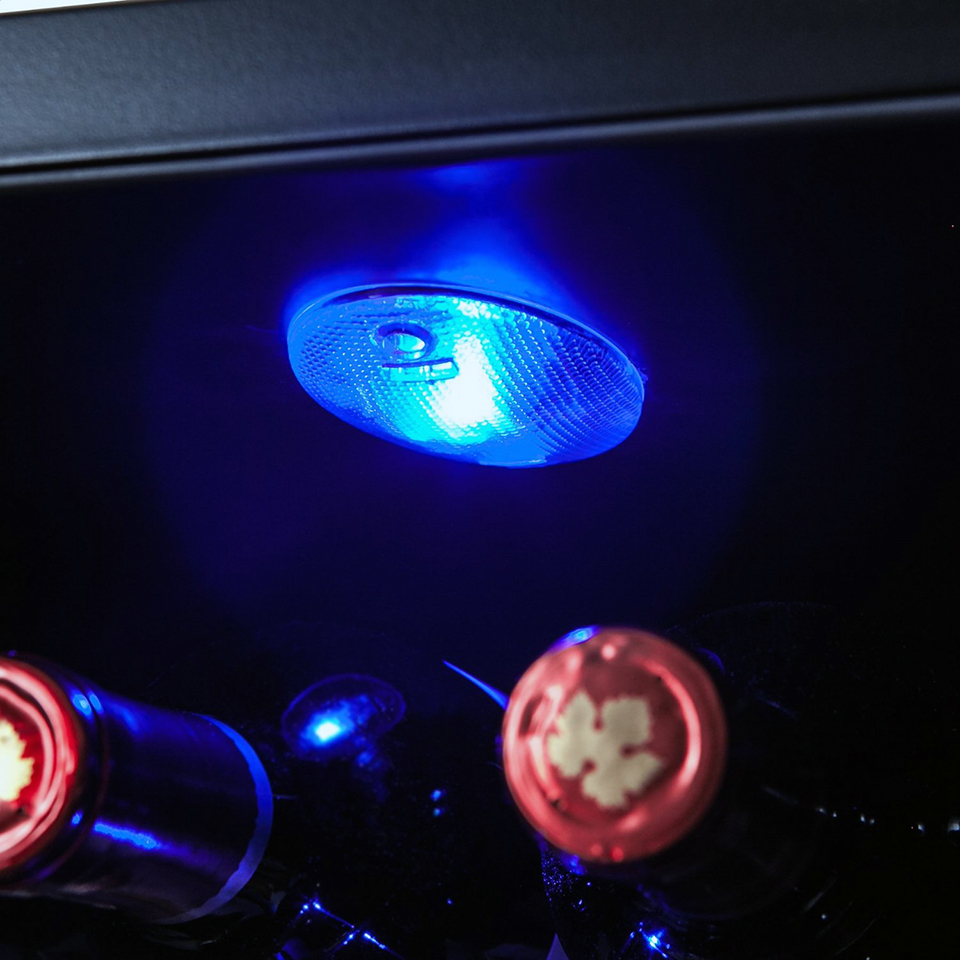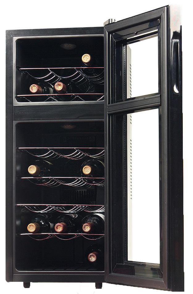 Модель имеет компактный размер и 2 независимые зоны охлаждения с универсальной технологией применения особого температурного режима внутри камер, тем самым позволяя сохранить все вкусовые и изысканные свойства вина. Винный шкаф оснащен цифровыми дисплеями в каждой зоне, принудительной циркуляцией воздуха с помощью вентиляторов, LED-подсветкой синего цвета.