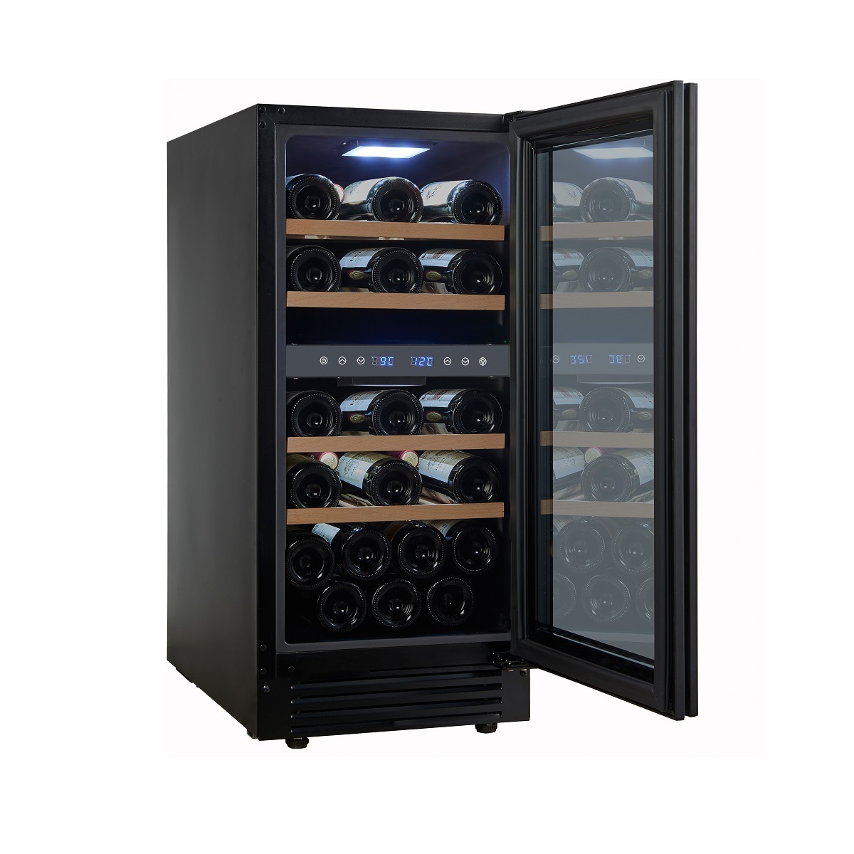 Модель оснащена холодильной камерой с 2 температурными зонами, 4 съемными полками, распашной перенавешиваемой дверью со скрытой рукояткой и прозрачным тонированным обзорным стеклом, а также сенсорной панелью управления с 2 цифровыми дисплеями внутри камеры.