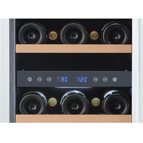 Модель оснащена холодильной камерой с 2 температурными зонами, 4 съемными полками, распашной перенавешиваемой дверью со скрытой рукояткой и прозрачным тонированным обзорным стеклом, а также сенсорной панелью управления с 2 цифровыми дисплеями внутри камеры.