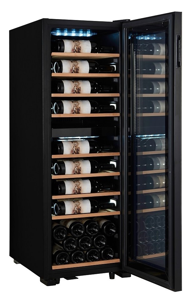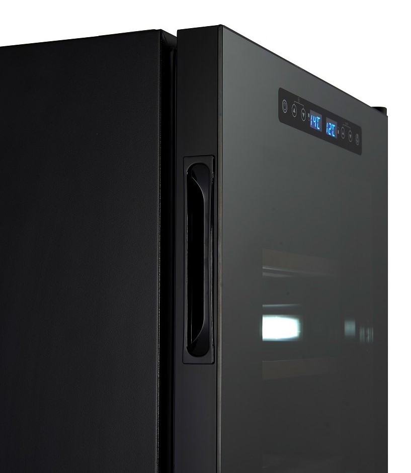 Температурный диапазон в камерах составляет от 5 до 12 °С и от 12 до 18 °С. Управление температурой и подсветкой осуществляется с помощью сенсорных кнопок, расположенных на стеклянной дверце.