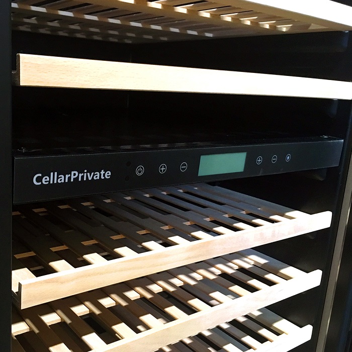 Модель имеет 2 зоны охлаждения с универсальной технологией применения особого температурного режима внутри камер, тем самым позволяя сохранить все вкусовые и изысканные свойства вина. Cellar Private CP165-2T оснащен цифровым дисплеем расположенным внутри камер, принудительной циркуляцией воздуха с помощью вентиляторов и LED-подсветкой синего цвета.