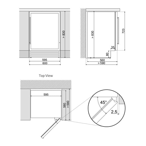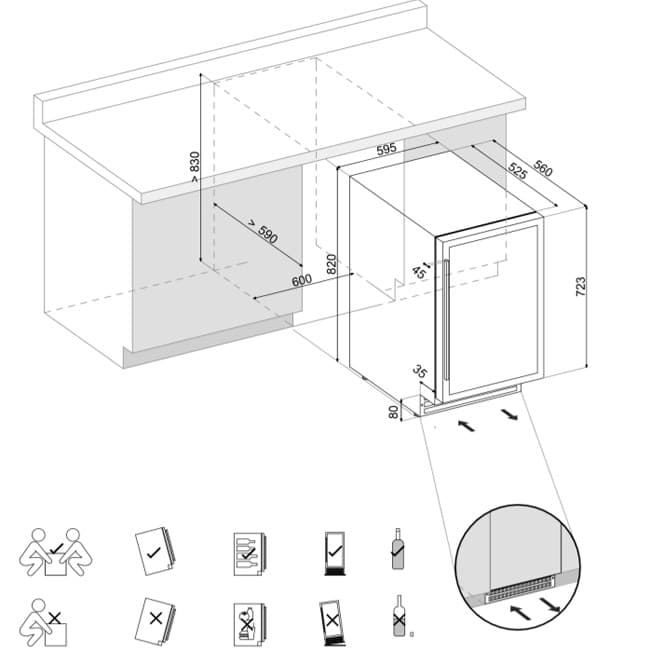 Винный шкаф устанавливается как отдельно стоящий, так и встраиваемый под столешницу/в нишу. Перенавешиваемая/реверсивная дверь с функцией Touch Open выполнена в монолитной стальной раме, что позволяет установить аналогичный винный шкаф рядом создавая эффект side-by-side.