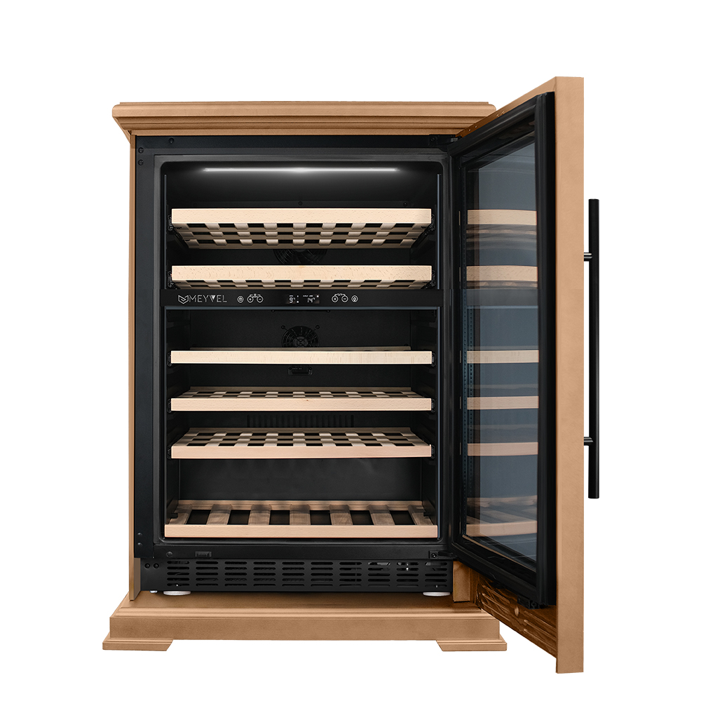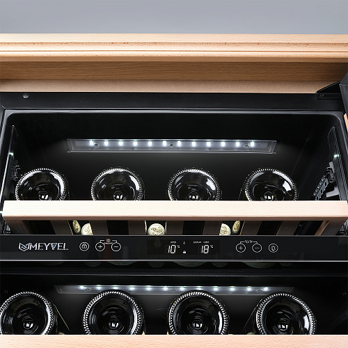 Компрессорный винный шкаф Meyvel MV46PRO-KBT2 (Натуральный бук) обладает большой вместимостью и даёт возможность разместить до 46 бутылок стандартного типа Бордо (0,75 л). Располагаются они на выкатных полках из дерева. Внутреннее пространство шкафа разделено на 2 температурные зоны, с возможностью настраивать каждую из них. Диапазон верхней зоны варьируется от +5°C до +12°C, а нижней - от +12°C до +20°C.
