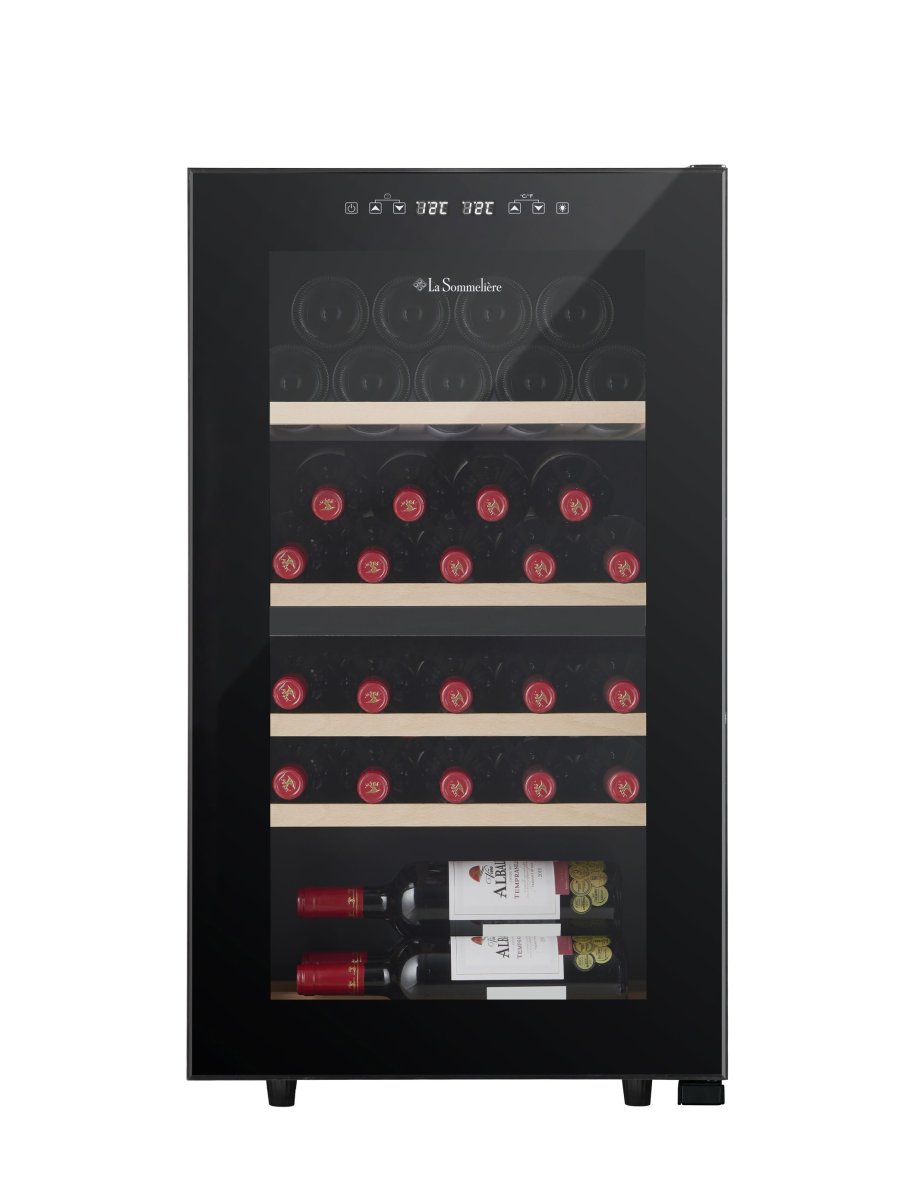 Винный шкаф La Sommeliere SLS32DZBLACK предназначен для размещения 32 бутылок (типа Бордо). В двух независимых температурных отсеках можно хранить различные сорта вин.