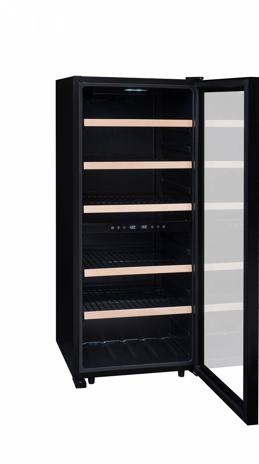 В двух независимых температурных отсеках можно хранить различные сорта вин. Шкаф оснащён практичными металлическими полками с деревянным фасадом.