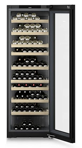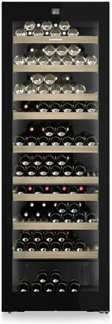 Винный шкаф Liebherr WPGbi 7472 Vinidor Selection в черном исполнении сочетает строгий архитектурный профиль и премиальные материалы. Его габариты 201.3×69.7×76.4 см делают устройство заметным, но вписывающимся в интерьер ресторана или частной коллекции. Фасад с двойным стеклопакетом в тонкой рамке защищает содержимое от ультрафиолета и визуально открывает бутылки, сохраняя при этом лаконичную эстетику. Скрытая ручка, черная сталь по бокам и сухая задняя панель создают единое поле для демонстрации этикеток.