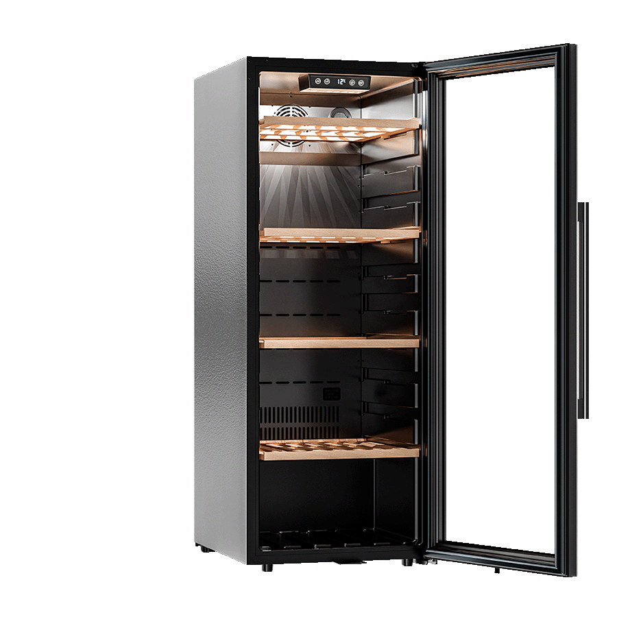 Винный шкаф комплектуется четырьмя деревянными полками, которые не только красиво выглядят, но и способствуют хорошей циркуляции воздуха. Дополнительно устанавливается до 6 полок, а также можно приобрести демонстрационную полку и полку для фужеров. Двойное стекло с UV-фильтром защищает вино от вредного света, сохраняя его вкус и аромат.