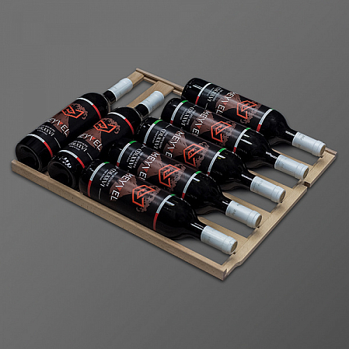 Полки выполнены из массива бука. Этот натуральный и крепкий материал не только имеет красивую текстуру, но и прекрасно гасит небольшую вибрацию. Так что Ваше вино будет храниться в абсолютном покое.