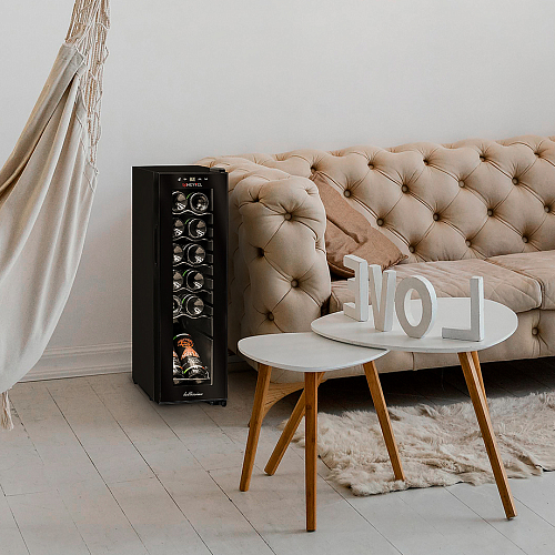 питания и торговли, в барах и ресторанах, в частных домах и квартирах. Модель имеет в комплекте 6 хромированных металлических полок, одна из них демонстрационная - позволяет сразу же обращать внимание на этикетку нужных вам сортов вина. Оснащен сенсорной панелью управления, электронным термостатом и светодиодной подсветкой белого цвета.