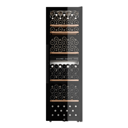 Управление осуществляется через сенсорную панель, а настройка интуитивно понятна. Также предусмотрены важные функции для защиты винотеки: замок на двери для безопасности, угольный фильтр, который очищает воздух внутри шкафа от посторонних запахов, сигнализация отклонения температуры, которая предупреждает о любых изменениях в условиях хранения, и блокировка панели управления, предотвращающая случайные изменения настроек.