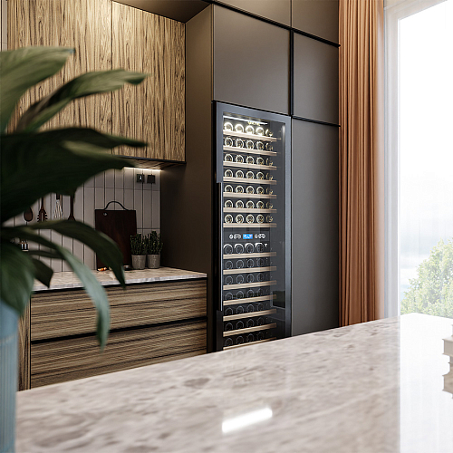 Винный шкаф MEYVEL MV160-KST2 используется для демонстрации, хранения и создания оптимальных условий для сохранения всех вкусовых свойств вина в бутылках на предприятиях общественного питания и торговли, в барах и ресторанах, в специализированных магазинах, частных домах и квартирах. Модель оснащена сенсорной панелью управления, 2 электронными термостатами и внутренней светодиодной подсветкой.Внутри шкафа поддерживается влажность в диапазоне 60-80%, как в настоящем винном погребе. Благодаря встроенной вентиляции, скрытым петлям и отсутствию выступающих частей, эта модель может быть не только отдельностоящей, но и устанавливаться в нишу с минимальными зазорами.