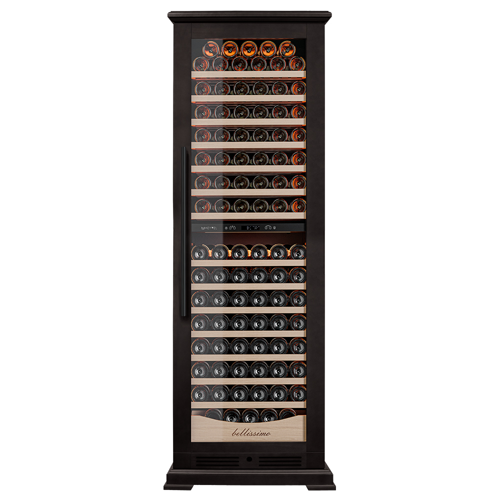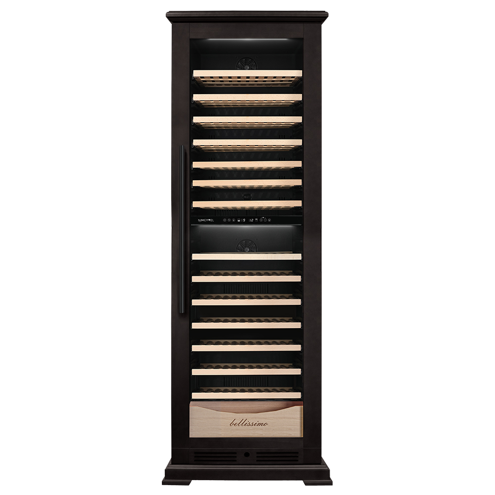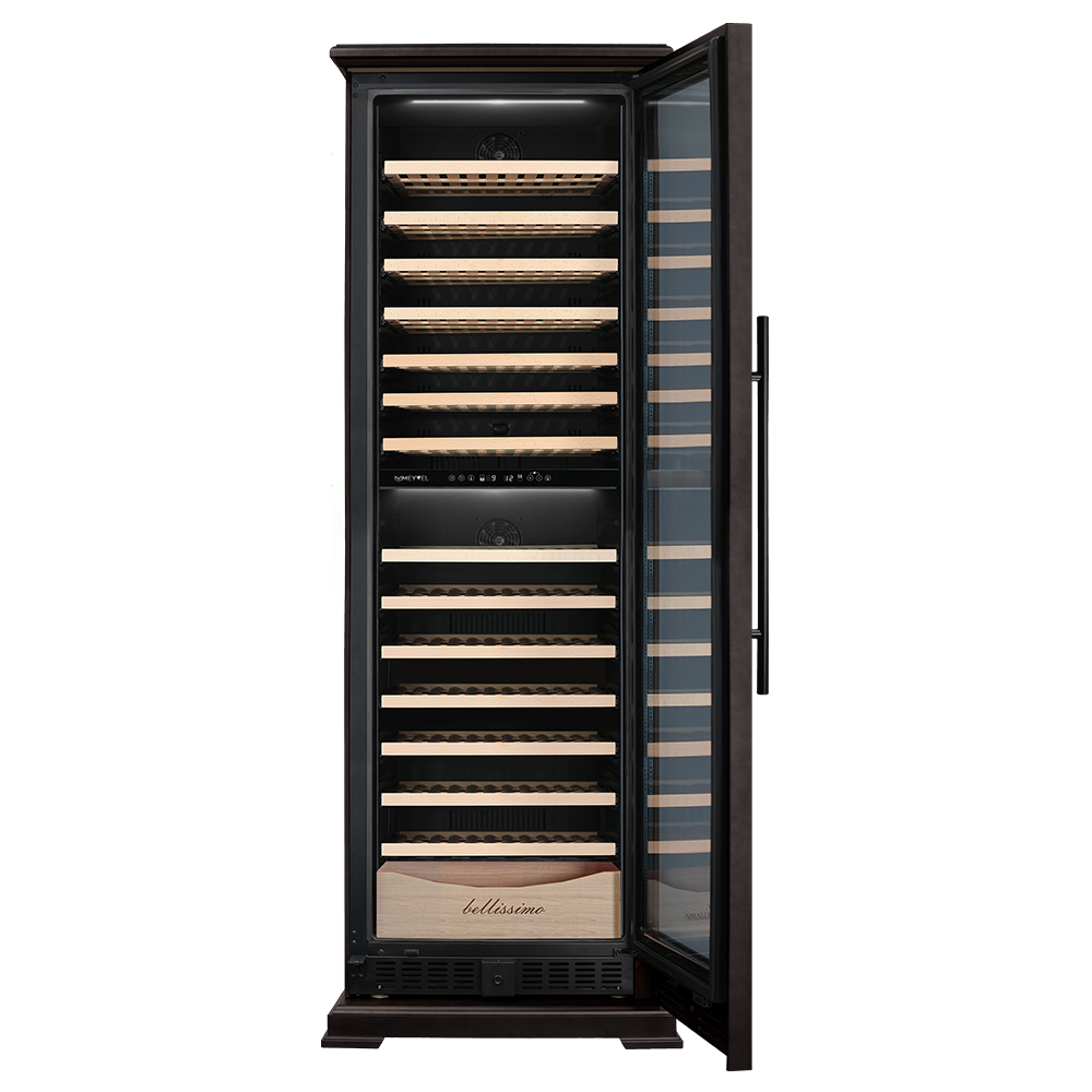 Винный шкаф MEYVEL MV163PRO-KBT2 (Тёмный шоколад) предназначен для профессионального и длительного хранения различных сортов вин (до 174 бутылок типа Бордо). Он так же оснащен дверью с защитой от ультрафиолетовых лучей и поддерживает влажность в диапазоне 60-80%, как в настоящем винном погребе. Стальной корпус обшит натуральным буком, который выдерживает большие нагрузки и обладает красивой текстурой.