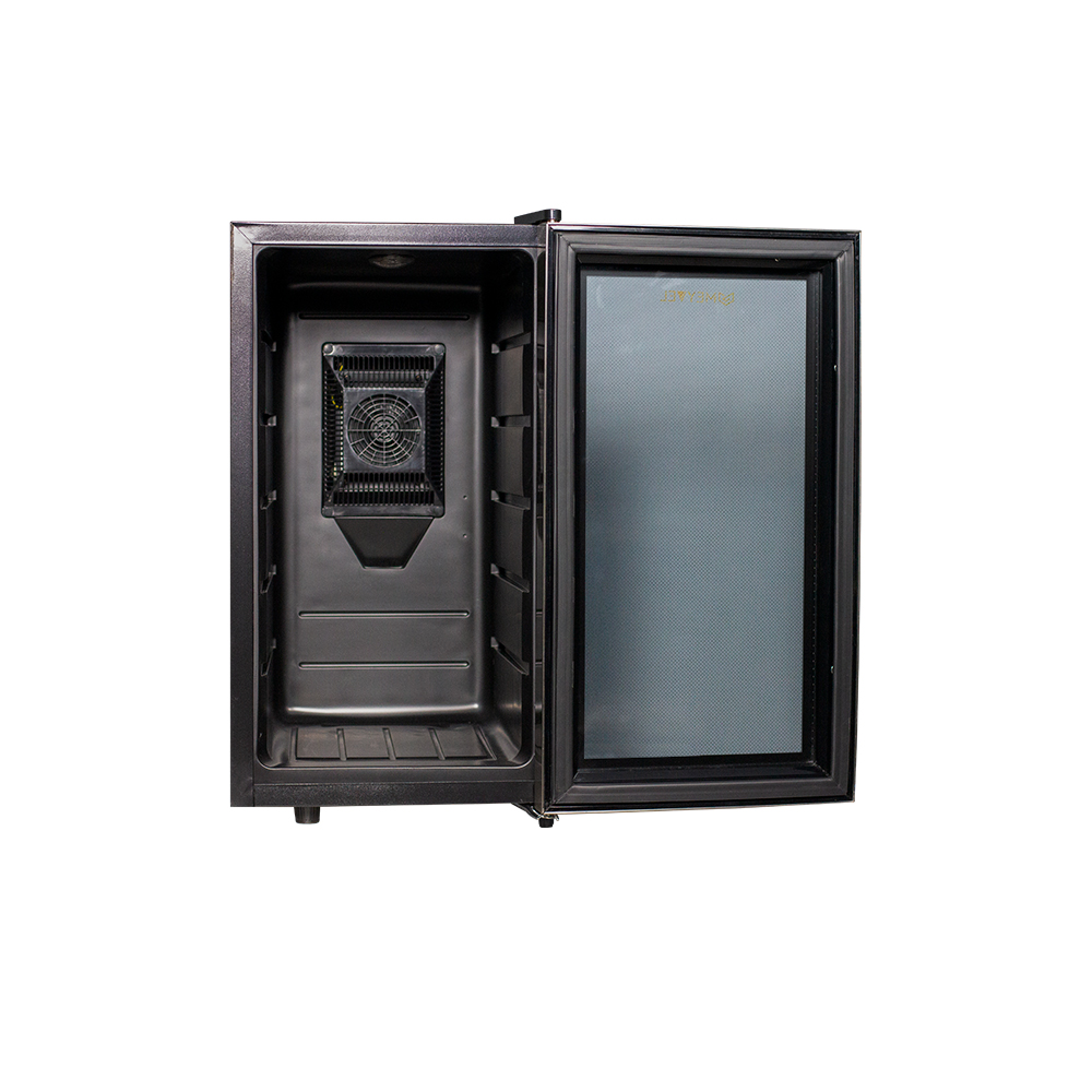 Корпус выполнен из окрашенной в черный цвет стали, дверь из стальной окантовки и двойного стекла с защитой от ультрафиолетовых лучей, ручка двери из стали, полки из массива бука.