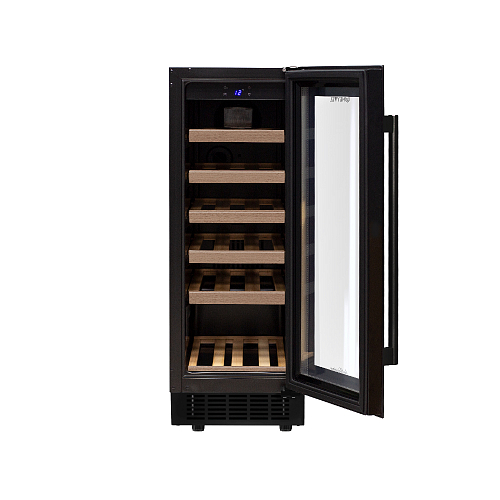 Корпус и дверная ручка выполнены из окрашенной в черный цвет стали, дверь - из тройного стекла с УФ защитой с черной рамкой, полки - из массива бука.
