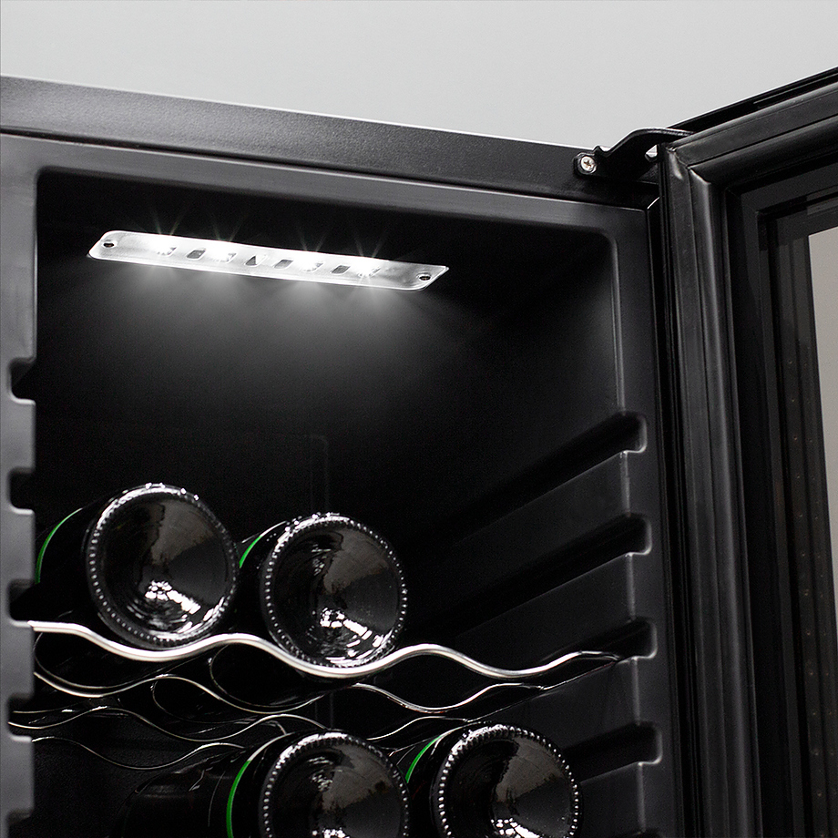питания и торговли, в барах и ресторанах, в частных домах и квартирах. Модель имеет в комплекте 8 хромированных металлических полок и одну демонстрационную полку, которая позволяет сразу же обращать внимание на этикетку нужных вам сортов вина. Оснащен сенсорной панелью управления, электронным термостатом и светодиодной подсветкой белого цвета.