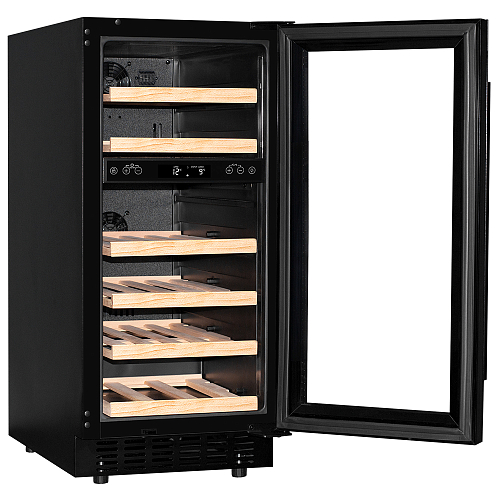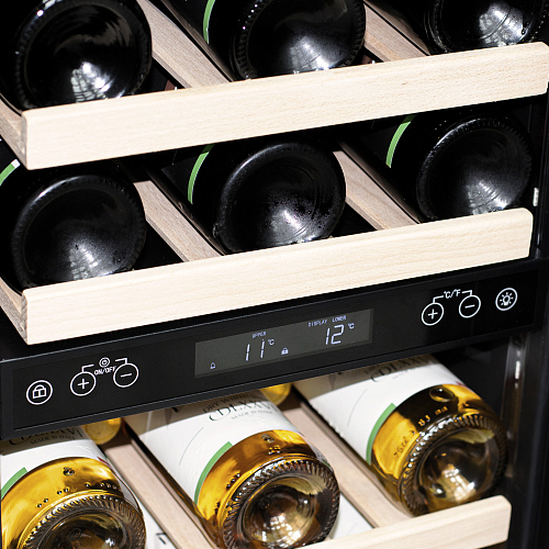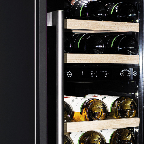 Модель оснащена сенсорной панелью управления, 2 электронными термостатами и внутренней белой светодиодной подсветкой. Корпус и дверная ручка выполнены из окрашенной в черный цвет стали, дверь - из тройного стекла с УФ защитой с черной рамкой, полки - из массива бука.
