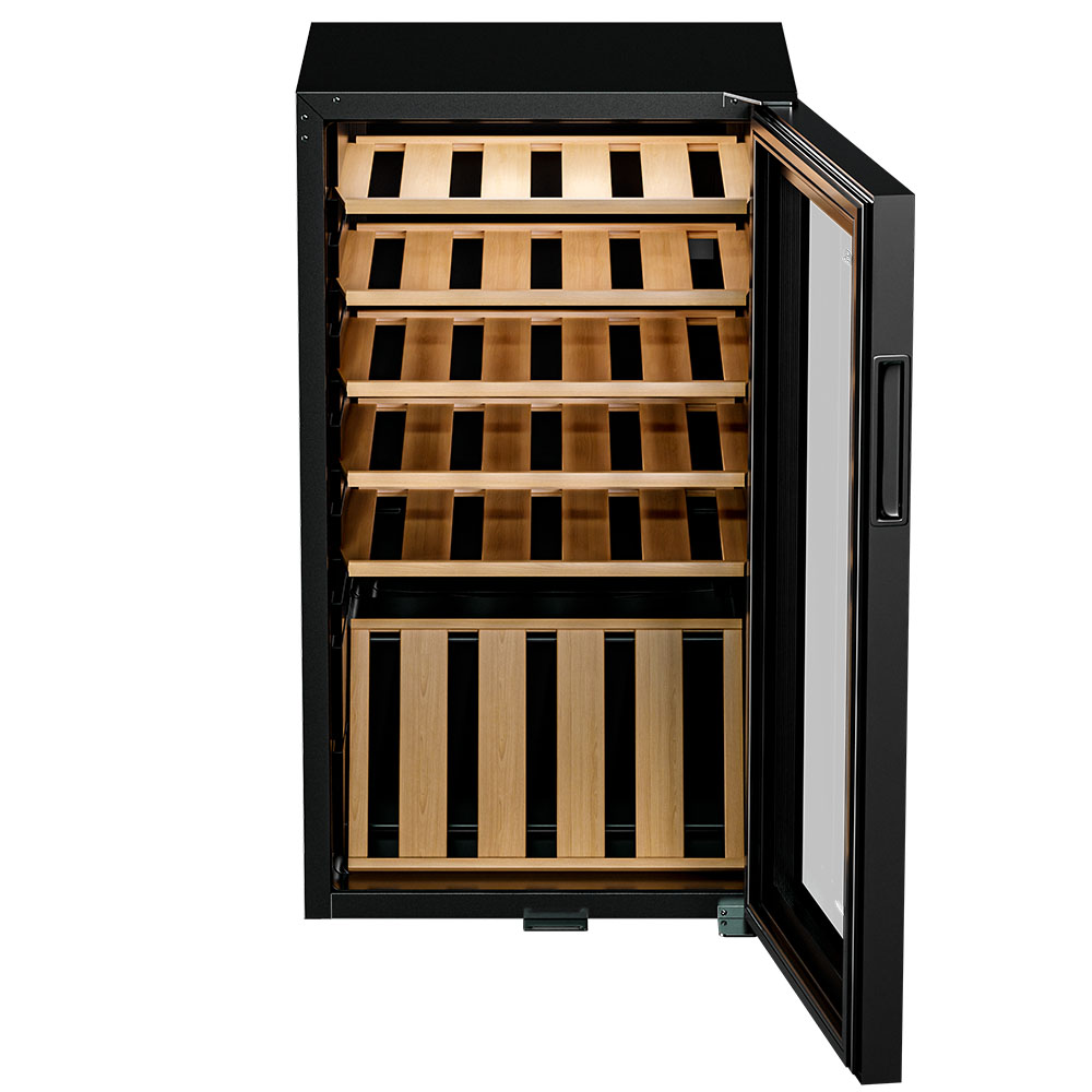 Двойное стекло с УФ-фильтром защищает вино от вредного воздействия ультрафиолетовых лучей, сохраняя его цвет и вкус. Выдвижные полки предоставляют легкий доступ к бутылкам, а демонстрационная полка помогает эффектно представить вашу коллекцию вин гостям.