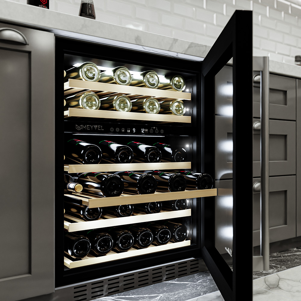 Винный шкаф MEYVEL MV46PRO-KST2 имеет привлекательный внешний вид, сочетающий в себе неподвластное времени очарование натуральных материалов с высокотехнологичными системами сохранения продуктов.