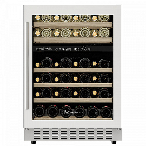 Компрессорный винный шкаф Meyvel MV46PRO-KWT2 обладает большой вместимостью и даёт возможность разместить до 46 бутылок стандартного типа Бордо (0,75 л). Располагаются они на выкатных полках из дерева. Внутреннее пространство шкафа разделено на 2 температурные зоны, с возможностью настраивать каждую из них. Диапазон верхней зоны варьируется от +5°C до +12°C, а нижней - от +12°C до +20°C.