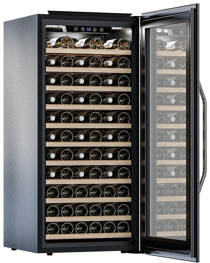 Винный шкаф MEYVEL MV66-KSB1 предназначен для демонстрации, хранения и создания оптимальных условий для сохранения всех вкусовых свойств вина в бутылках на предприятиях общественного питания, торговли, в барах, ресторанах, специализированных магазинах, частных домах или квартирах. Модель оснащена удобным электронным управлением, белым панорамным освещением, угольным фильтром и регулируемыми по высоте ножками. Корпус и дверная ручка выполнены из стали, дверь - из двойного стекла с УФ защитой со стальной окантовкой, полки - из массива бука.