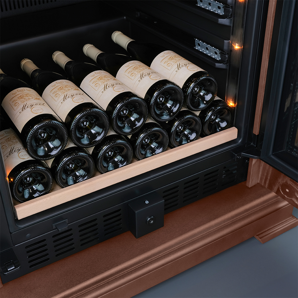 В винном шкафу установлен угольный фильтр, который будет очищать поступающий воздух, ведь посторонние запахи губительно влияют на вкусовые качества вина.