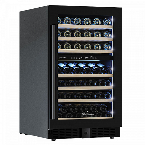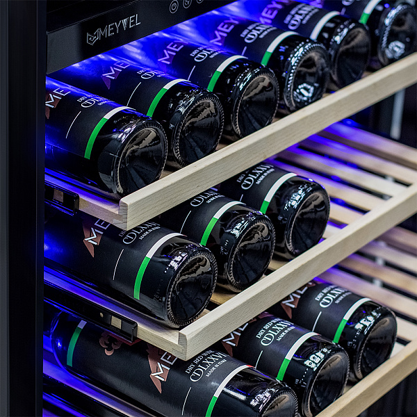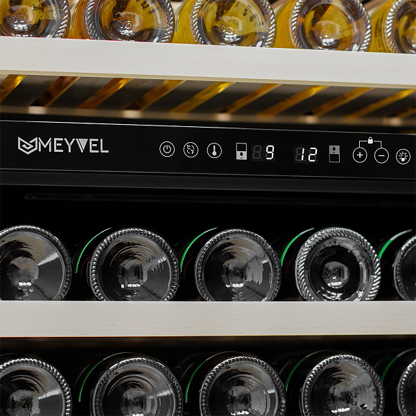 Компрессорный винный шкаф Meyvel MV77PRO-KBT2 обладает большой вместимостью и способен разместить до 77 бутылок. Располагаются они на полках из массива бука. Внутреннее пространство шкафа разделено на 2 температурные зоны с возможностью настройки в диапазоне от + 5°C до +20°C. Холодильник поддерживает влажность в диапазоне 60-80%, как в настоящем винном погребе.
