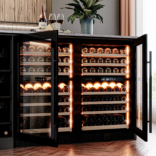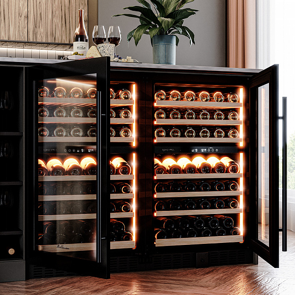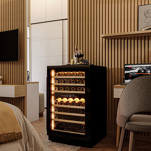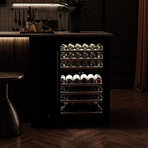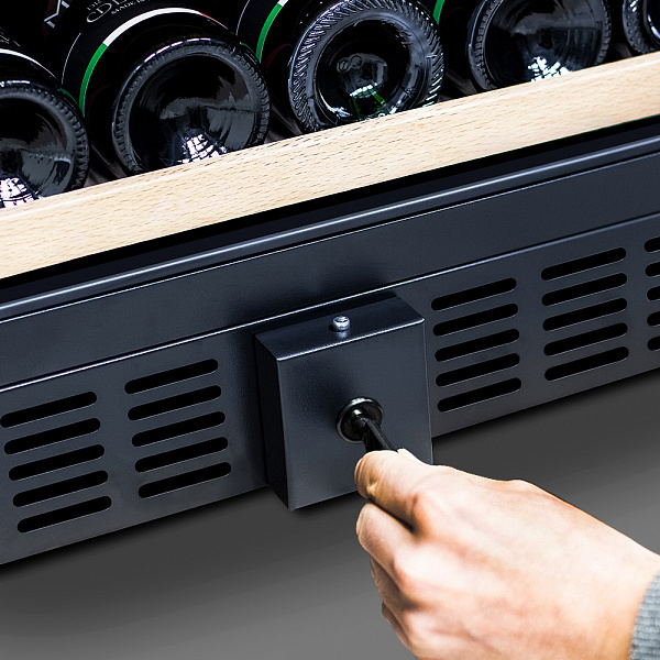Винный холодильник оснащен дверью с защитой от ультрафиолетовых лучей и отлично подойдет для хранения и созревания различных сортов вин. Динамическая система охлаждения обеспечивает оптимальную температуру для вина и сохраняет необходимую влажность внутри камеры.