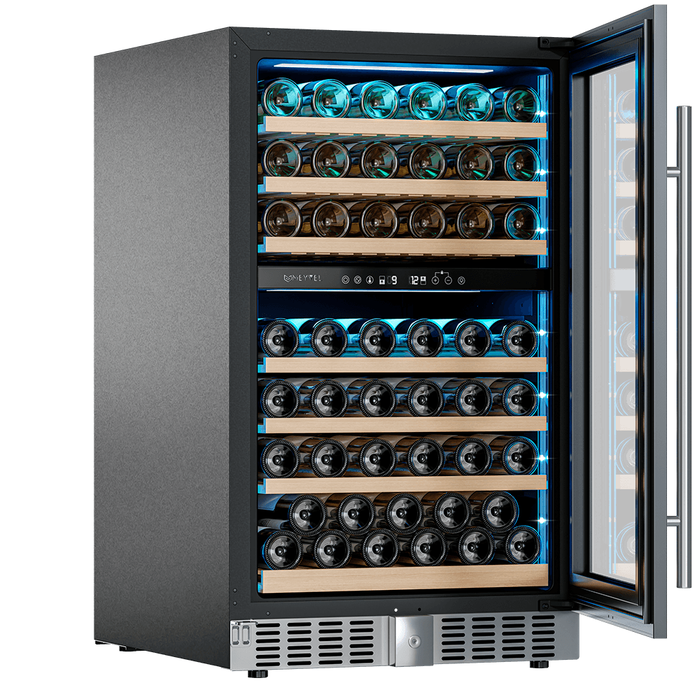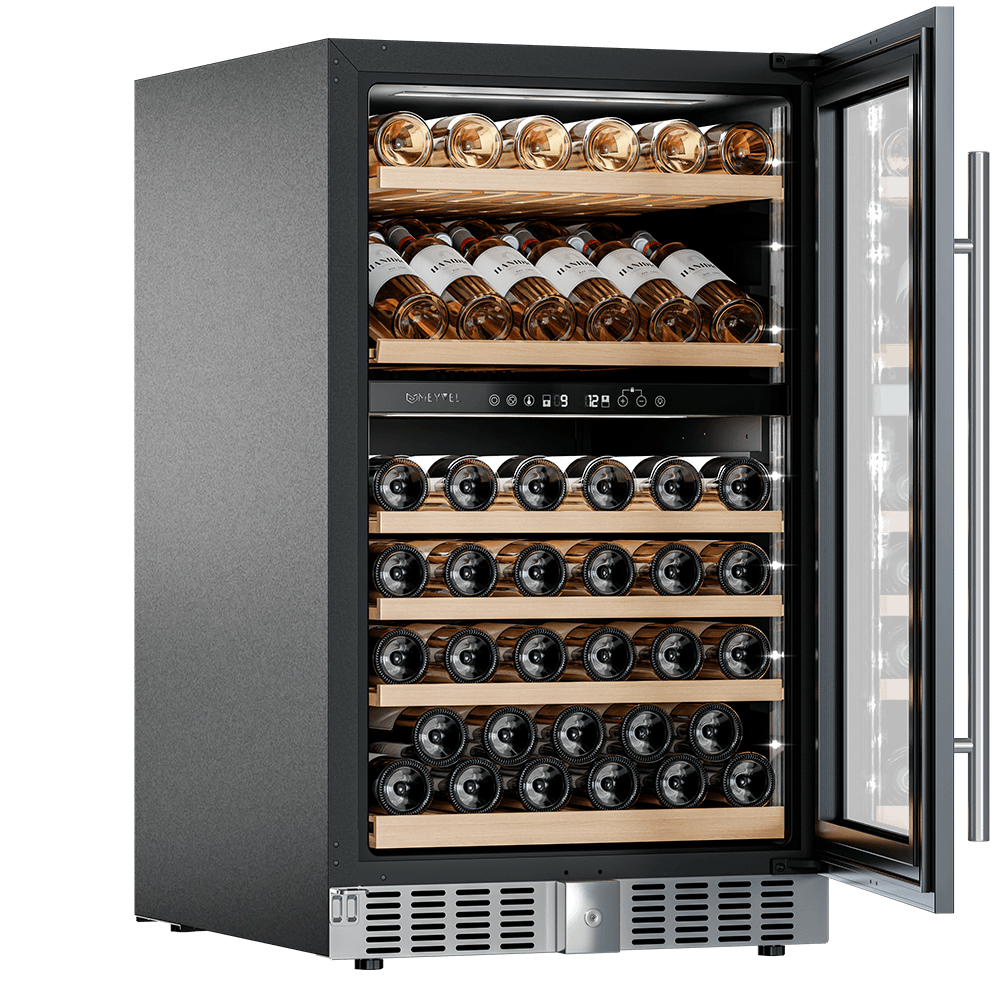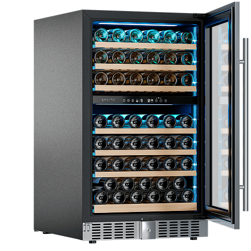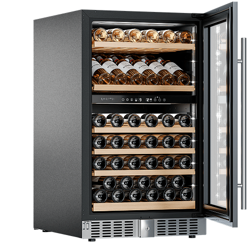 Компрессорный винный шкаф Meyvel MV77PRO-KST2 обладает большой вместимостью и способен разместить до 77 бутылок. Располагаются они на полках из массива бука. Внутреннее пространство шкафа разделено на 2 температурные зоны с возможностью настройки в диапазоне от + 5°C до +20°C. Холодильник поддерживает влажность в диапазоне 60-80%, как в настоящем винном погребе.