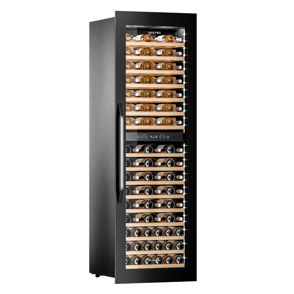 Винный шкаф MEYVEL MV83-KBB2 предназначен для демонстрации, хранения и создания оптимальных условий для сохранения всех вкусовых свойств вина в бутылках на предприятиях общественного питания, торговли, в барах, ресторанах, специализированных магазинах, частных домах или квартирах. Модель оснащена сенсорной панелью управления, электронным термостатом и внутренней белой светодиодной подсветкой. Корпус и дверная ручка выполнены из окрашенной в черный цвет стали, дверь - из двойного стекла с УФ защитой с черной рамкой, полки - из массива бука.