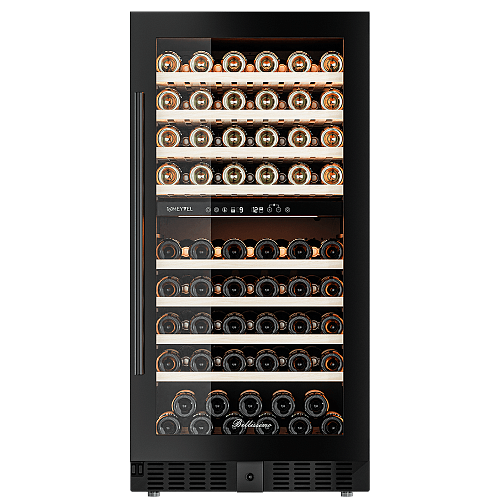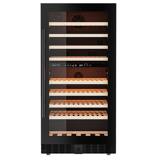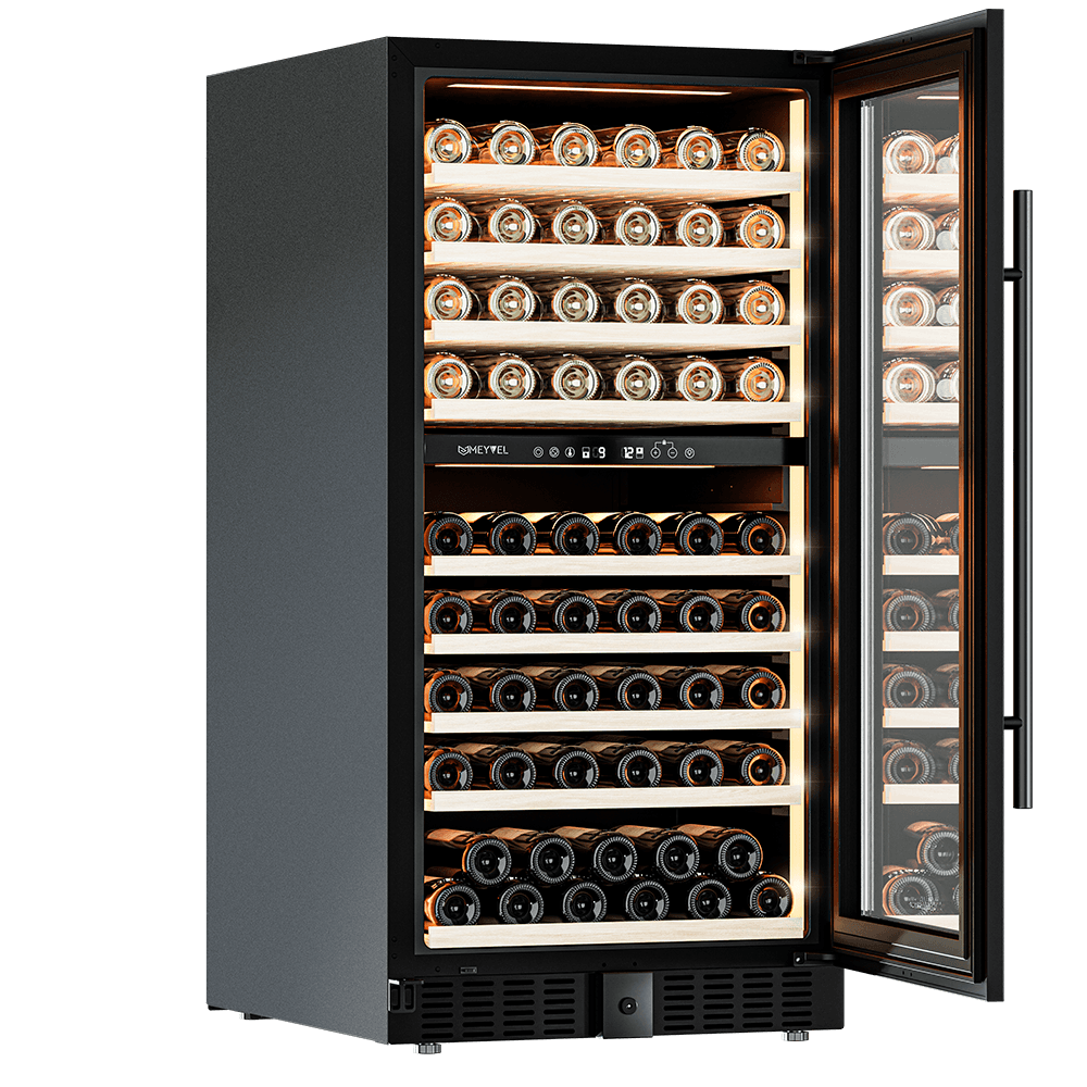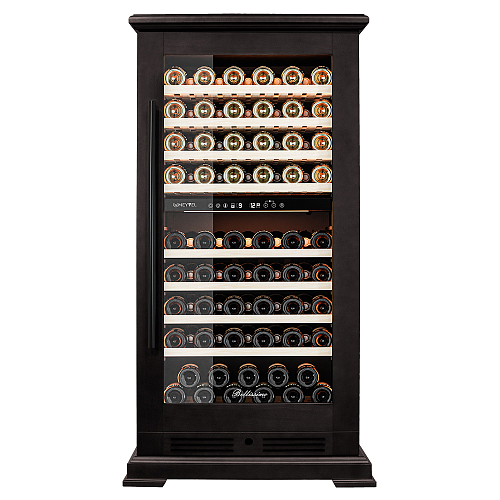 Компрессорный винный шкаф Meyvel MV99PRO-KBT2 обладает большой вместимостью и способен разместить до 99 бутылок. Располагаются они на полках из массива бука. Внутреннее пространство шкафа разделено на 2 температурные зоны с возможностью настройки в диапазоне от + 5°C до +20°C. Холодильник поддерживает влажность в диапазоне 60-80%, как в настоящем винном погребе.