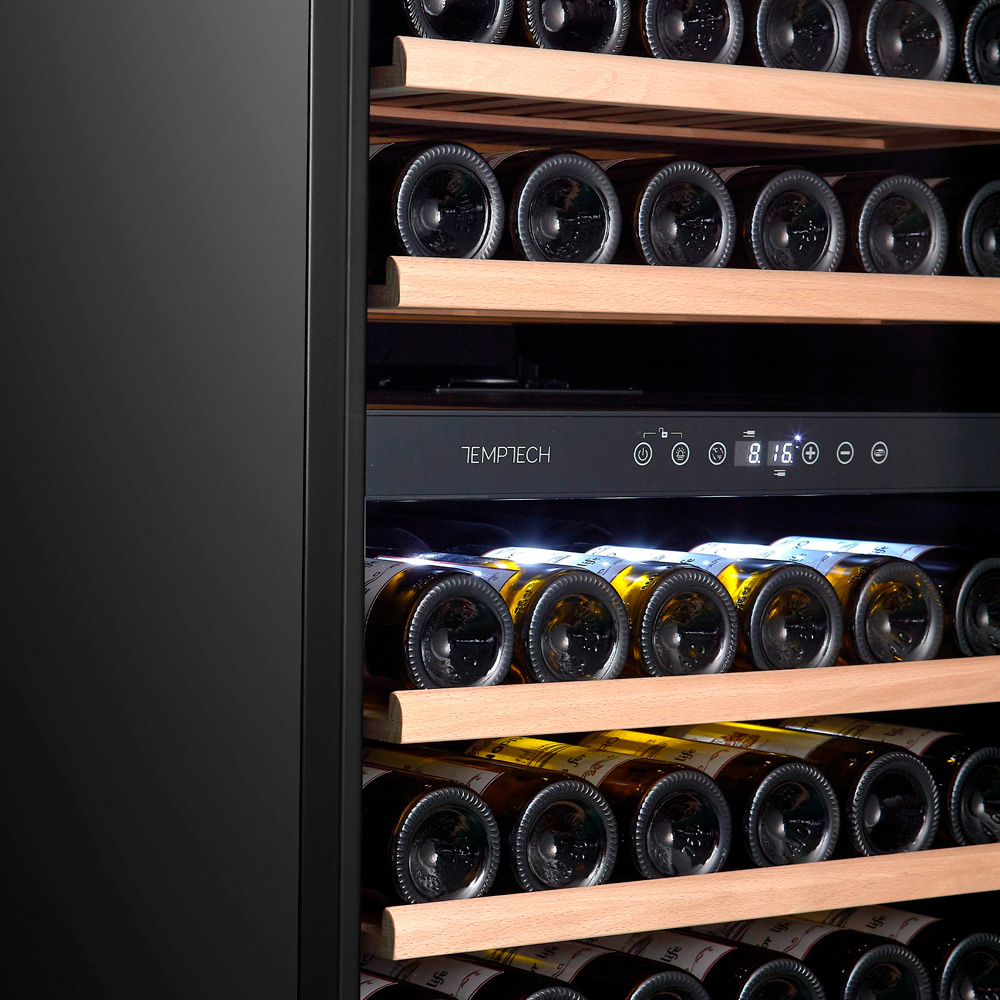 Винный шкаф Temptech CL120DB с двумя температурными зонами (5-12°C, 12-20°C) и вместимостью до 94 бутылок вина.