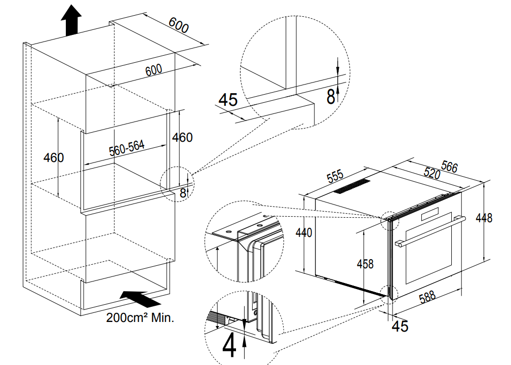 • Габариты (В×Ш×Г): 448 × 595 × 565 мм (в нишу)