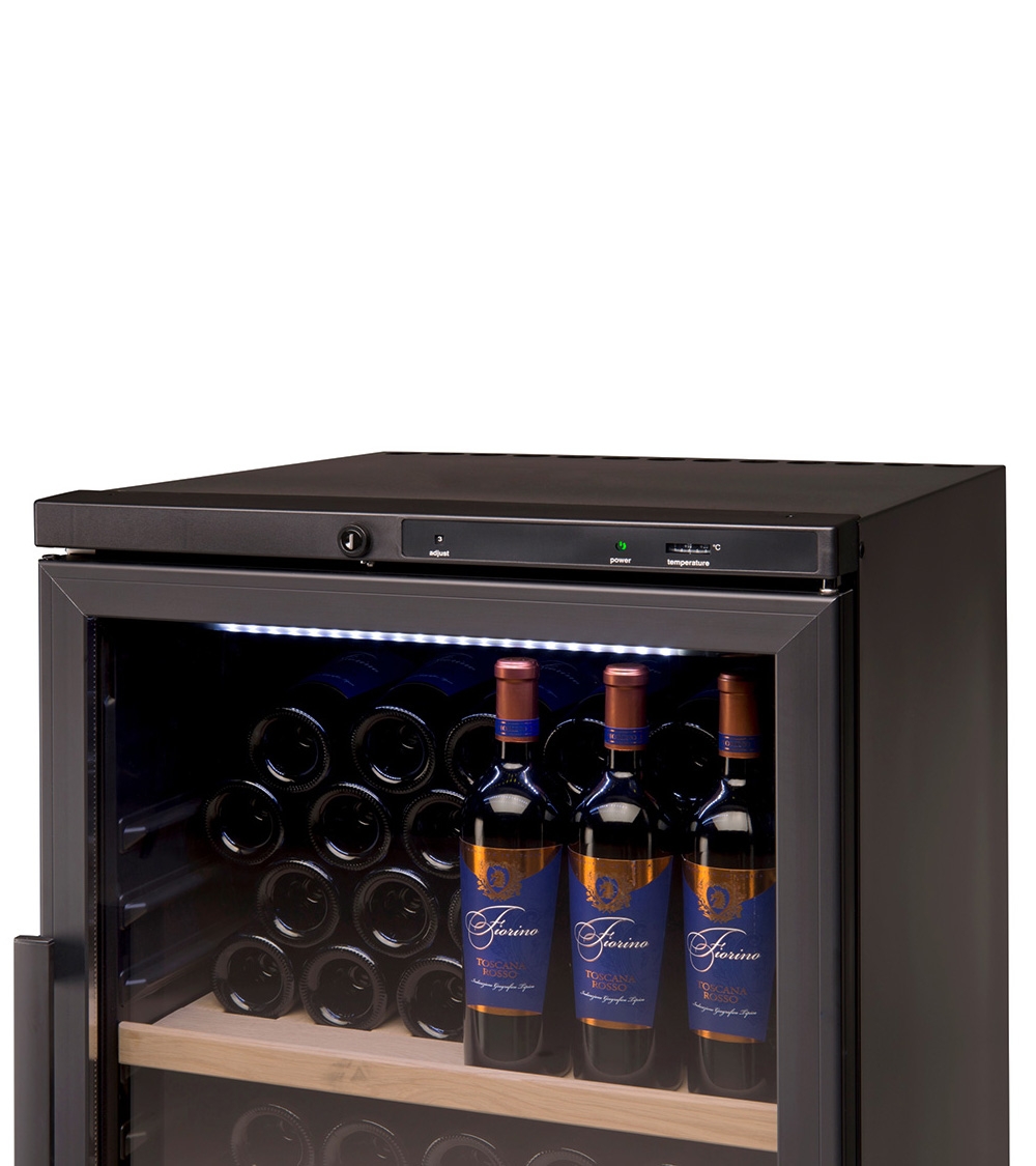 Шкаф имеет белую LED подсветку, которая не нагревает камеру, а также замок для защиты от несанкционированного доступа, для удобства перемещения винный шкаф оборудован роликами в задней части. Предусмотрена возможность перевешивания двери, а, также, шкаф оснащен регулируемыми ножками для установки на неровном полу (ключ в комплекте).