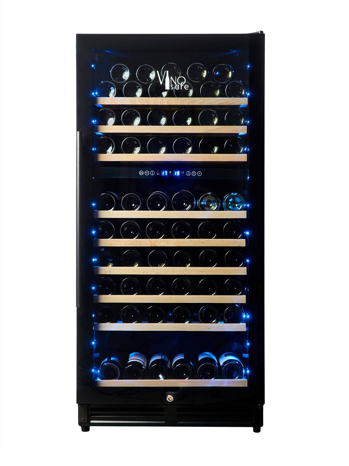 На внешней поверхности шкафа VinoSafe VSN110AD размещена сенсорная панель для управления, а в нижней части вмонтирован замок, закрывающийся на ключ.