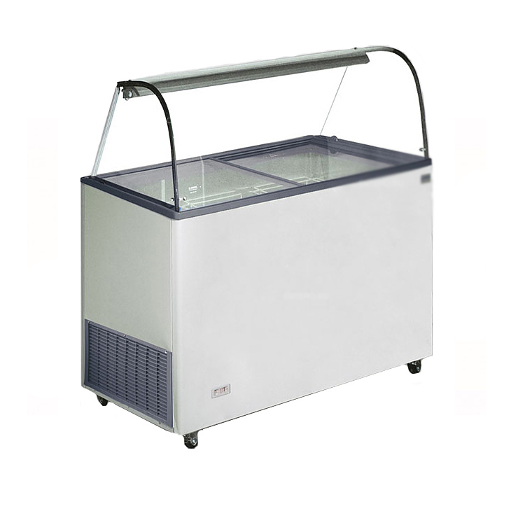 Одна из самых доступных морозильных витрин для мороженого. Эта греческая витрина по принципу работы напоминает морозильный ларь со стеклянными крышками, но всё же имеет конструктивные особенности:стеклянная конструкция-надстройка накрывает пространство над стеклянными створками витрины, а у моделей VENUS VITRINE 36, 46 и 56 есть охлаждаемая камера (запасник) для хранения запаса товара, который закрывается на дверцу. Таким образом, вы сможете хранить прямо в месте продажи большее количество товара, что позволит увеличить прибыль от продажи мороженого, т.к. все вкусы будут всегда в наличии!