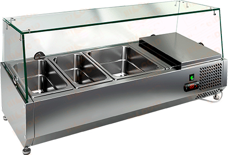 Витрина для ингредиентов Hicold VRTG 1000 устанавливается на предприятиях общественного питания и торговли для демонстрации, охлаждения и кратковременного хранения салатов, гарниров, закусок и других готовых блюд. Стеклянная надстройка и ножки. Корпус нержавеющая сталь.